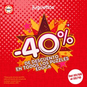 Descuento -40% en puzzles Educa en Juguettos Descuento en todos los puzzles Educa. Descuento directo del 40% sobre el importe de la compra con cualquier